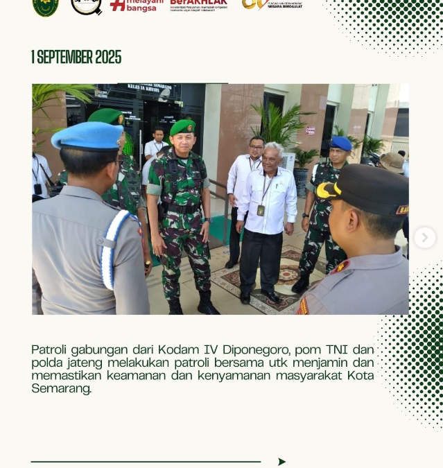 Patroli gabungan dari Kodam IV Diponegoro, pom TNI dan Polda Jateng melakukan patroli bersama untuk menjamin dan memastikan keamanan dan kenyamanan masyarakat kota Semarang.