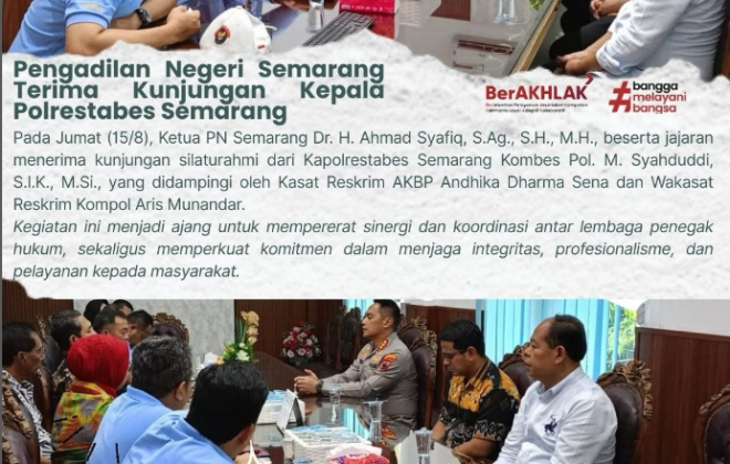 Kegiatan berlangsung di Ruang Sidang Kusumah Atmaja pada pukul 08.30 WIB serta diikuti oleh seluruh hakim, pejabat struktural, serta pegawai Pengadilan Negeri Semarang